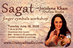 Add rhythm to your dance! Join Jocelyne Khan for a 1.5-hour Sagat (finger cymbals) workshop at Shenkman Arts Centre on Tues June 16 at 7pm. Learn rhythms, coordination, and zill techniques.. Handout included. Spots are limited, register now!