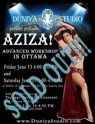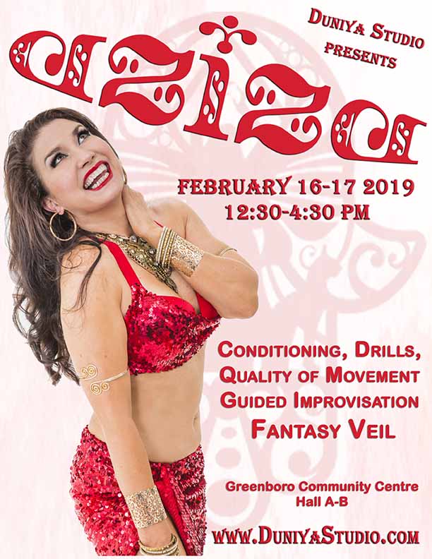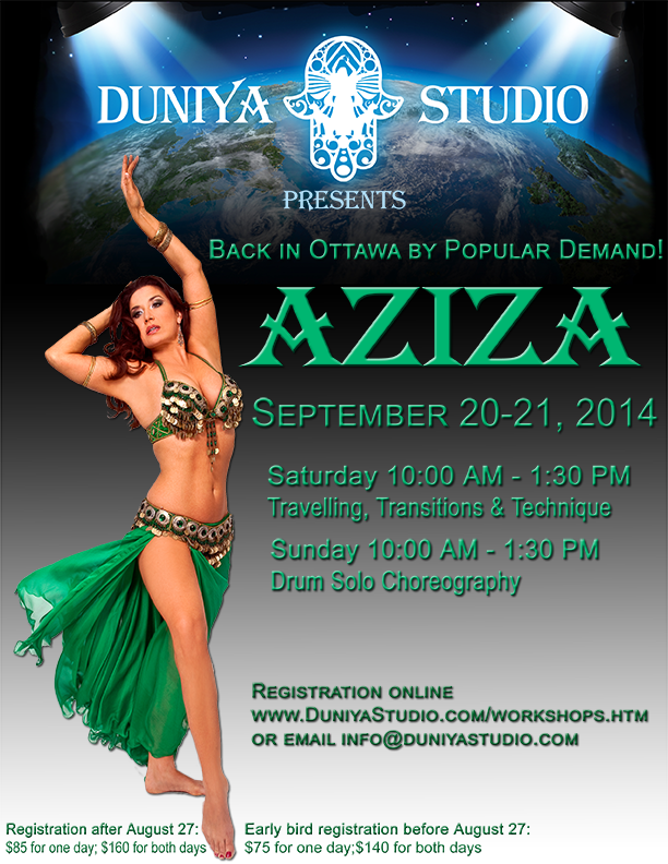 I first encountered Aziza at workshops in Montreal (circa 2004, if I remember correctly), and was so inspired that I even wrote a review for Mazagine Papyrus (“un vrai bijou est arrivé à Montréal”). Later, Ottawa got a taste of her brilliance thanks to workshops hosted by my dance friends Safiya, Hala, and Anna, and then through a couple of workshops that my own teacher, Denise Enan, hosted at Oasis de la danse in Gatineau (and which I happily helped to arrange). Those experiences planted the seed, and in 2014, I organized my very first workshop with Aziza myself!
