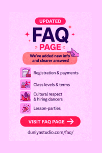 Raqs sharqi is a rich and vibrant dance with deep roots in Southwest Asian and North African cultures. At Duniya Studio, we welcome all students — whether or not they have cultural origins in these regions — as long as they approach the dance with respect, curiosity, and humility. Learning with awareness and honouring the communities who sustain the tradition allows everyone to enjoy and contribute to this living art form.